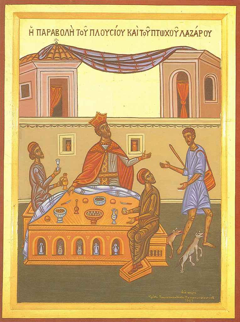 In quel tempo. Il Signore Gesù disse: «C’era un uomo ricco, che indossava vestiti di porpora e di lino finissimo, e ogni giorno si dava a lauti banchetti. Un povero, di nome Lazzaro, stava alla sua porta, coperto di piaghe, bramoso di sfamarsi con quello che cadeva dalla tavola del ricco; ma erano i cani che venivano a leccare le sue piaghe. Un giorno il povero morì e fu portato dagli angeli accanto ad Abramo. Morì anche il ricco e fu sepolto. Stando negli inferi fra i tormenti, alzò gli occhi e vide di lontano Abramo, e Lazzaro accanto a lui. Allora gridando disse: “Padre Abramo, abbi pietà di me e manda Lazzaro a intingere nell’acqua la punta del dito e a bagnarmi la lingua, perché soffro terribilmente in questa fiamma”. Ma Abramo rispose: “Figlio, ricòrdati che, nella vita, tu hai ricevuto i tuoi beni, e Lazzaro i suoi mali; ma ora in questo modo lui è consolato, tu invece sei in mezzo ai tormenti. Per di più, tra noi e voi è stato fissato un grande abisso: coloro che di qui vogliono passare da voi, non possono, né di lì possono giungere fino a noi”. E quello replicò: “Allora, padre, ti prego di mandare Lazzaro a casa di mio padre, perché ho cinque fratelli. Li ammonisca severamente, perché non vengano anch’essi in questo luogo di tormento”. Ma Abramo rispose: “Hanno Mosè e i Profeti; ascoltino loro”. E lui replicò: “No, padre Abramo, ma se dai morti qualcuno andrà da loro, si convertiranno”. Abramo rispose: “Se non ascoltano Mosè e i Profeti, non saranno persuasi neanche se uno risorgesse dai morti”».